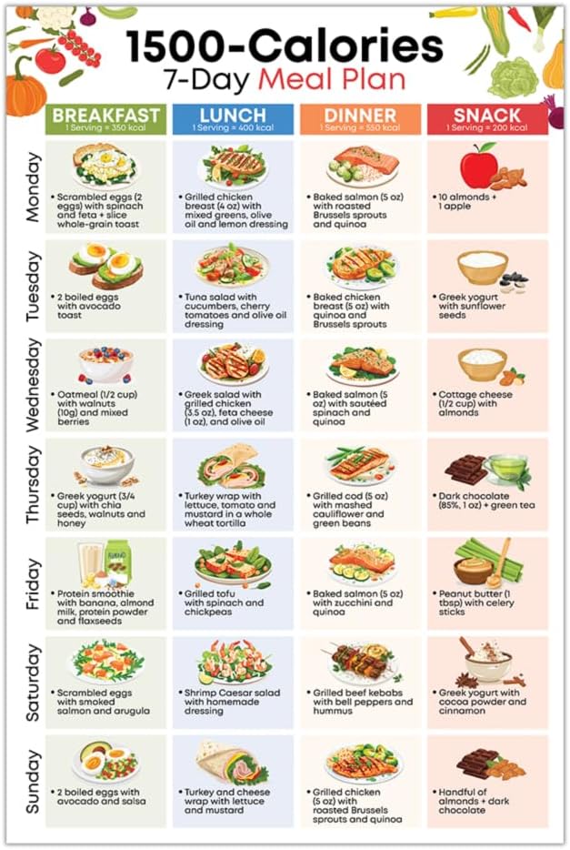 Stay on track with our 1500-Calorie Meal Plan Poster! Packed with balanced meal ideas for breakfast, lunch, dinner, and snacks, it’s a simple and visual guide to support healthy eating and portion control. Perfect for your kitchen or wellness space!