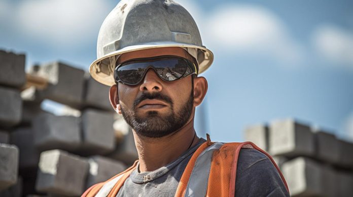 A construction worker wearing a hard hat and safety glasses at a site, carrying concrete blocks.