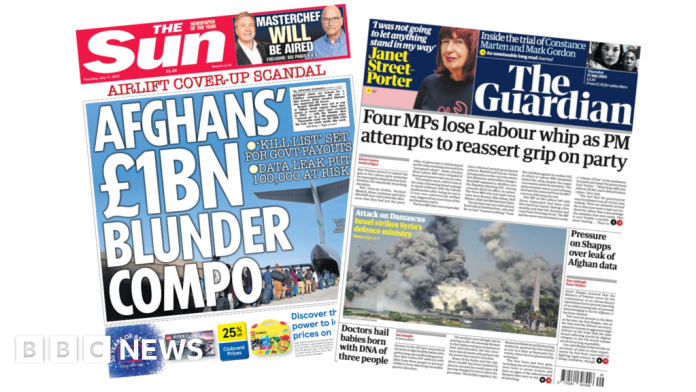 The Afghan data breach is dominating the papers for the second day in a row. A High Court judge lifted the superinjuction on Tuesday that had barred reporting on the leak for two years. “Cabinet bid to halt Afghan airlift”, leads The Daily Telegraph which reports a number of ministers objected to plans to grant asylum to thousands of Afghans. The paper says it was forced through using “emotional blackmail” amid a “toxic” atmosphere.