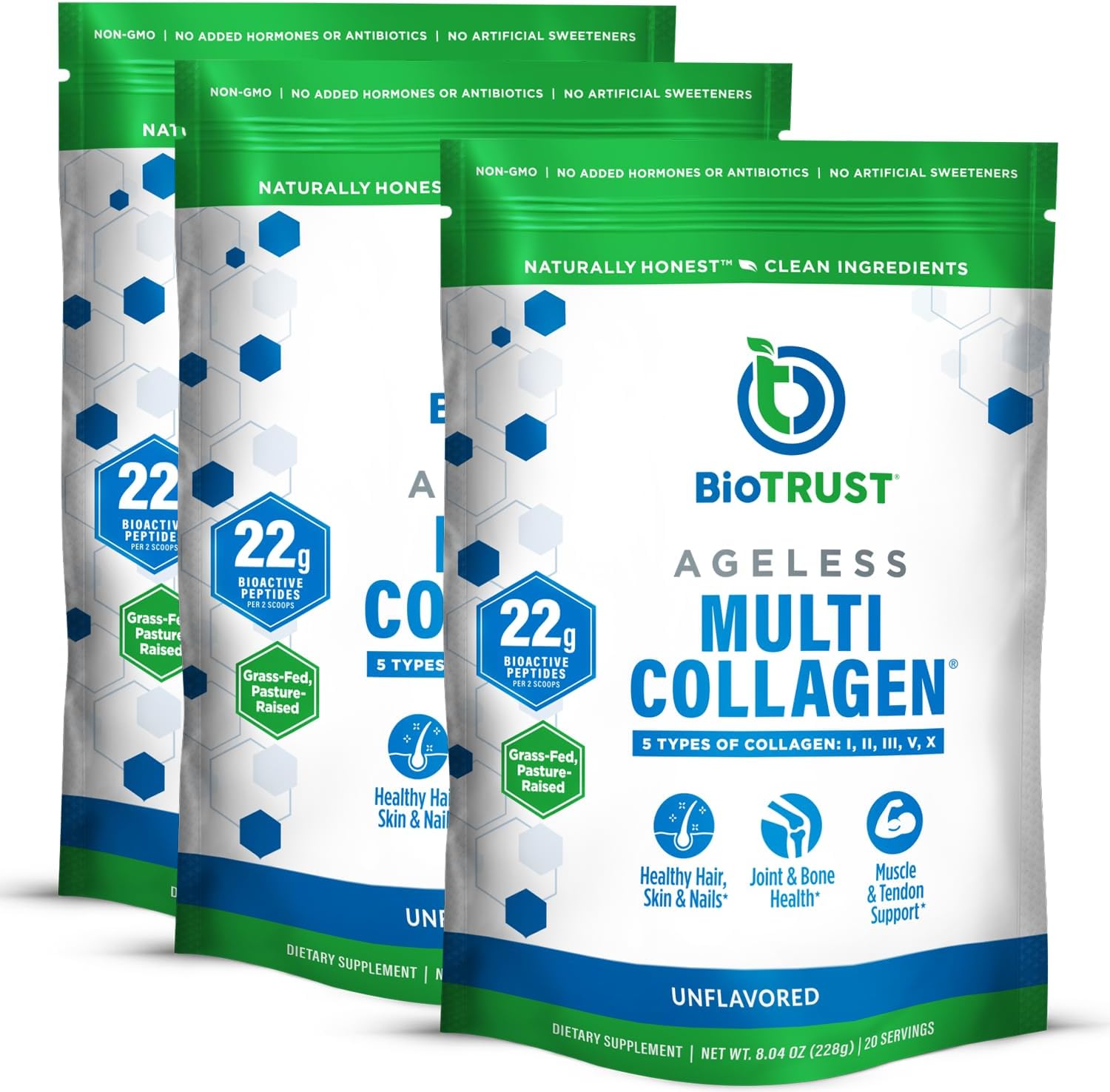 BioTrust Ageless Multi Collagen Peptides Powder – 5 Types (I, II, III, V, X) – Unflavored Collagen Powder for Women & Men – Hydrolyzed Protein – Grass Fed Beef, Fish, Chicken, Eggshell Membrane, 3-pk