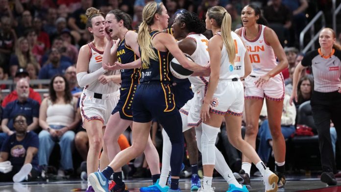 With 46.1 seconds remaining, the Fever’s Sophie Cunningham committed a hard foul on the Sun’s Jacy Sheldon as she attempted a breakaway layup, with an altercation ensuing between the players and eventually enveloping teammates, coaches and security as they tried to quell the tensions.