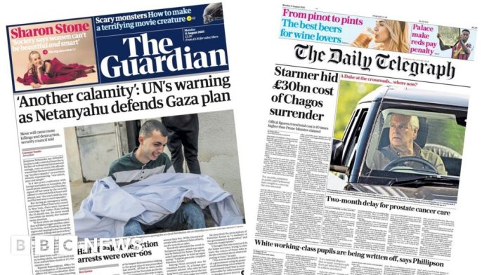 Israel’s defence of its plan to take control of Gaza City as global condemnation grows features prominently on Monday’s papers. The Guardian leads with a striking image of a Palestinian man crying as it report that more people were killed by Israeli forces opening fire at a food distribution site over the weekend. The paper quotes the UN’s warning to Benjamin Netanyahu that his Gaza takeover plan will likely “trigger another calamity”. At a press conference, Netanyahu responded to a question about Palestinians being killed at aid sites, saying “a lot of firing was done by Hamas”.