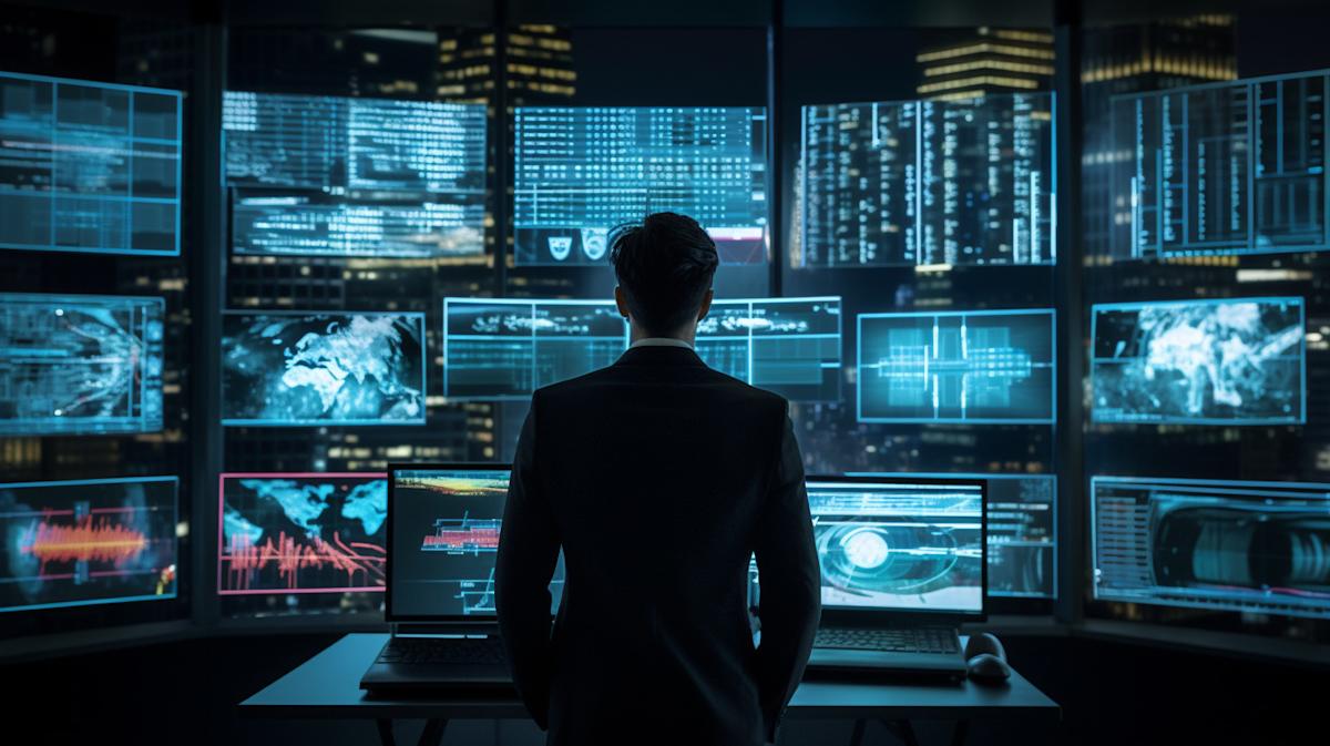A network analyst in front of a wall of screens analyzing financial data.