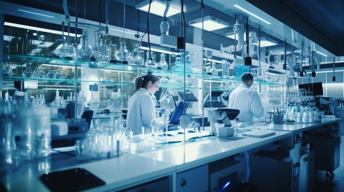 A laboratory setup with technicians in lab coats working in a biotech facility.