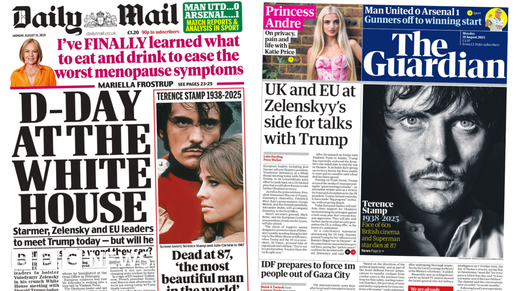 It’s “D-Day at the White House”, says the Daily Mail, as Ukrainian President Volodymyr Zelensky, Prime Minister Sir Keir Starmer and EU leaders prepare to meet US President Donald Trump. But “will he listen to a single word they say,” it poses. The death at 86 of superman star Terrance Stamp also features.