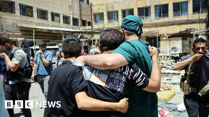 AFP A health worker and other men walk in a hospital courtyard, past the bodies of victims of the recent clashes in Syria's southern city of Suweida on 17 July 2025AFP