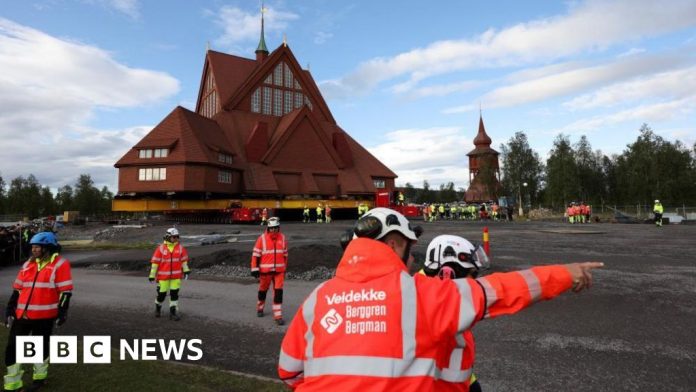ReutersA landmark 113-year-old church at risk from ground subsidence is being relocated in its entirety – in a 5km (3 miles) move along a road in Sweden’s far north.