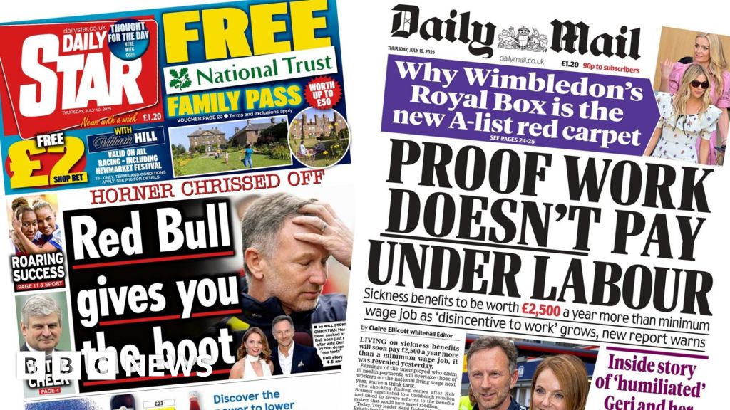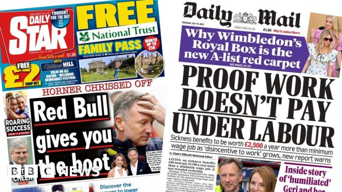 The Daily Mail’s front page pictures the “humiliated” Geri and Christian Horner, but its lead story is based on fresh analysis suggesting “work doesn’t pay under Labour”. The Centre for Social Justice think tank has warned that sickness benefits will soon be worth “more than a minimum wage job”, the paper reports. This “shocking finding” comes after Prime Minister Sir Keir Starmer failed to secure benefits cuts earlier this month, it adds.