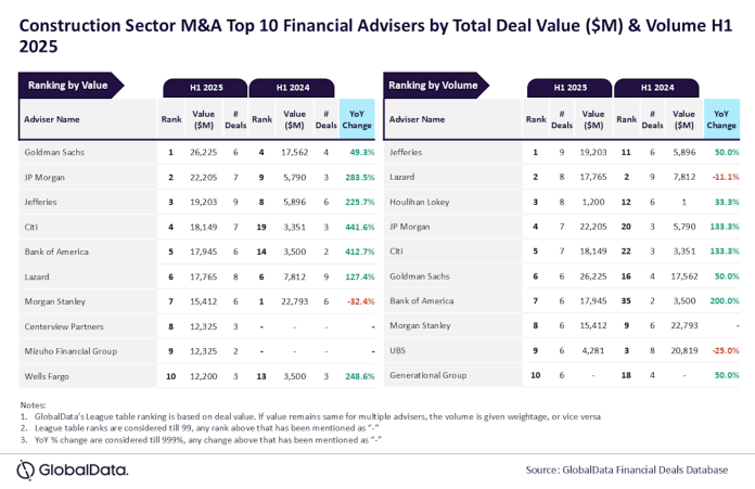 Goldman Sachs has emerged as the leading financial adviser in the construction sector for mergers and acquisitions (M&As) in terms of value during the first half (H1) of 2025, according to the latest league table published by leading data and analytics company GlobalData.
