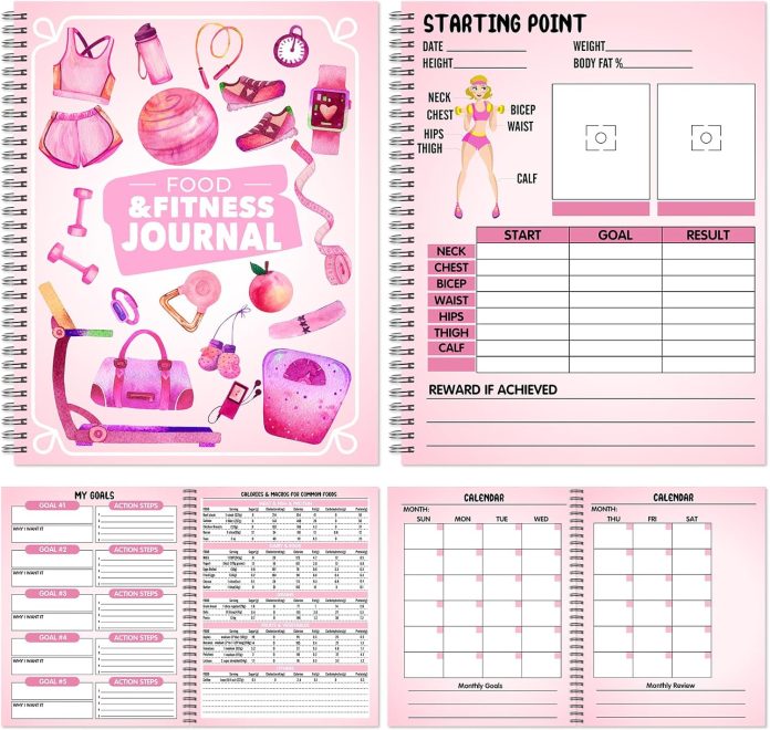 Careful Design: our workout log notebook is designed with eye-catching cover, printed with some attractive elements, such as fitness clothes, gym bags, treadmills, barbells, scales, skipping ropes, etc, vivid and cute, filling you with the desire to keep fit; The inner page design also contains rich content, including my goals, foods calorie counter, calendars, full body workout, fat-burning guidance, track your progress page and so on, carefully create a week food and fitness plan for you