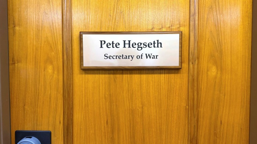 Secretary of Defense Pete Hegseth posted a video to social media Friday showing the nameplate on his office being changed to reflect President Trump’s renaming of the Department of Defense.