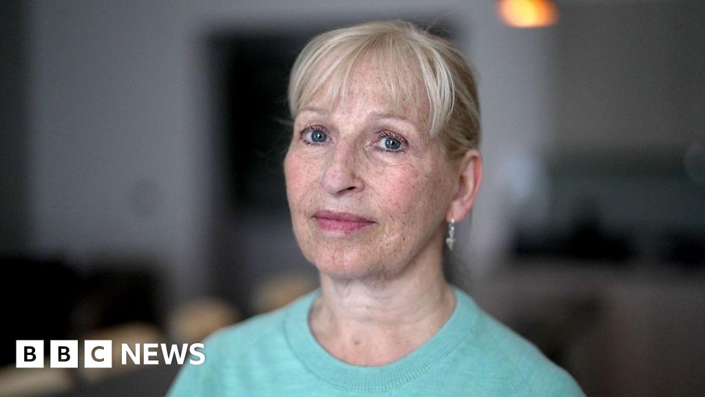 Brijesh Patel / BBC Caroline looks into the camera - she has short, light-colored hair and is wearing a light blue sweater. The setting appears to be indoors with low lighting. In the background, indistinct furniture is visible, contributing to a subdued atmosphere. An orange light source glows in the upper right corner, casting a warm hue over part of the scene.Brijesh Patel / BBC