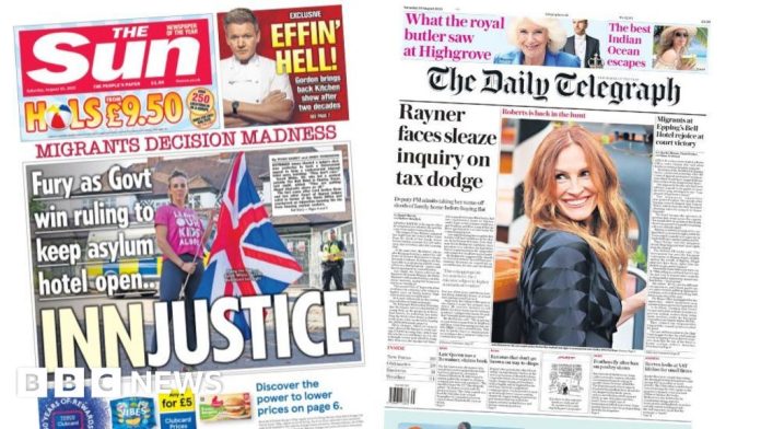 The High Court ruling which means asylum seekers can stay at The Bell Hotel in Epping, Essex, is on many front pages. The Times reports that 13 councils are still seeking to shut asylum hotels despite the victory by the Home Office. Home Office minister Dame Angela Eagle is quoted as saying that the government will stick to its plans to end the use of the hotels by 2029. The Sun brands the ruling an “innjustice”, while the Daily Express says campaigners are calling for ministers to “hang their heads in shame”.