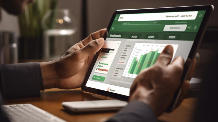 A close up of a hand pressing a mobile banking app displayed on a tablet or smartphone.