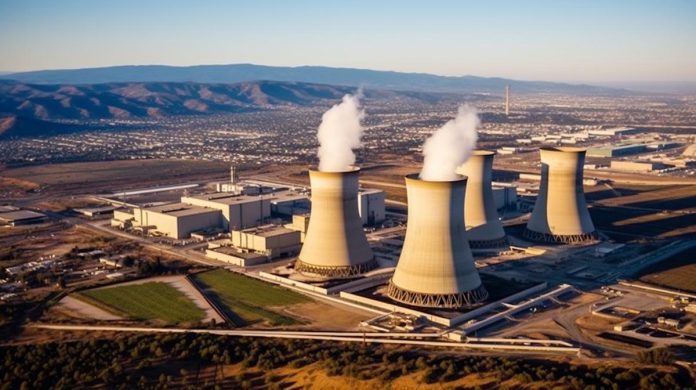 An aerial view of a nuclear plant, its domes casting a unique shadow.