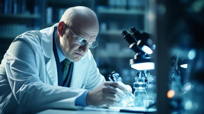 A medical researcher in a laboratory focusing on a diagnosis of an ocular disease.