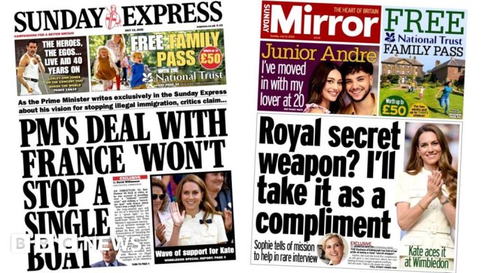 A “wave” of support for the princess headlines the Sunday Express’s Wimbledon report. Also dominating the front page is an “exclusive message” from Sir Keir Starmer hitting back at critics who say his migrant deal with France “won’t stop a single boat”. Writing in the paper, the prime minister gives a “full-throttle defence” of his record on stopping illegal immigration.