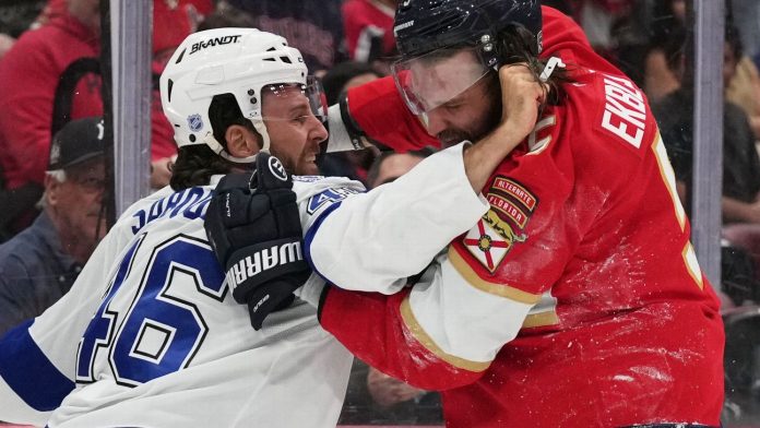 The parade to the penalty boxes started about two minutes into the game when Tampa Bay’s Scott Sabourin — who was among six players the Lightning called up for the game — went after Florida’s Aaron Ekblad. Sabourin got a major penalty after playing 19 seconds.