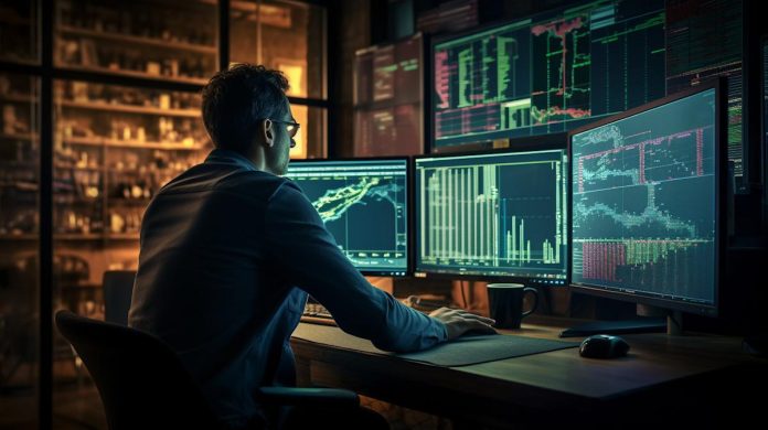 A financial analyst at a trading desk, monitoring large scale investments in real-time.