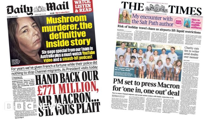 Emmanuel Macron’s state visit to the UK is splashed across several of the front pages, with the French president due to arrive on Tuesday. The Times reports that Sir Keir Starmer will urge Macron to agree a “one in, one out” migrant returns deal, despite warnings that announcing it before it is ready will lead to a surge in crossings. Also featured is a poignant picture of the girls who died or are missing after floods in Texas swept through their summer camp.