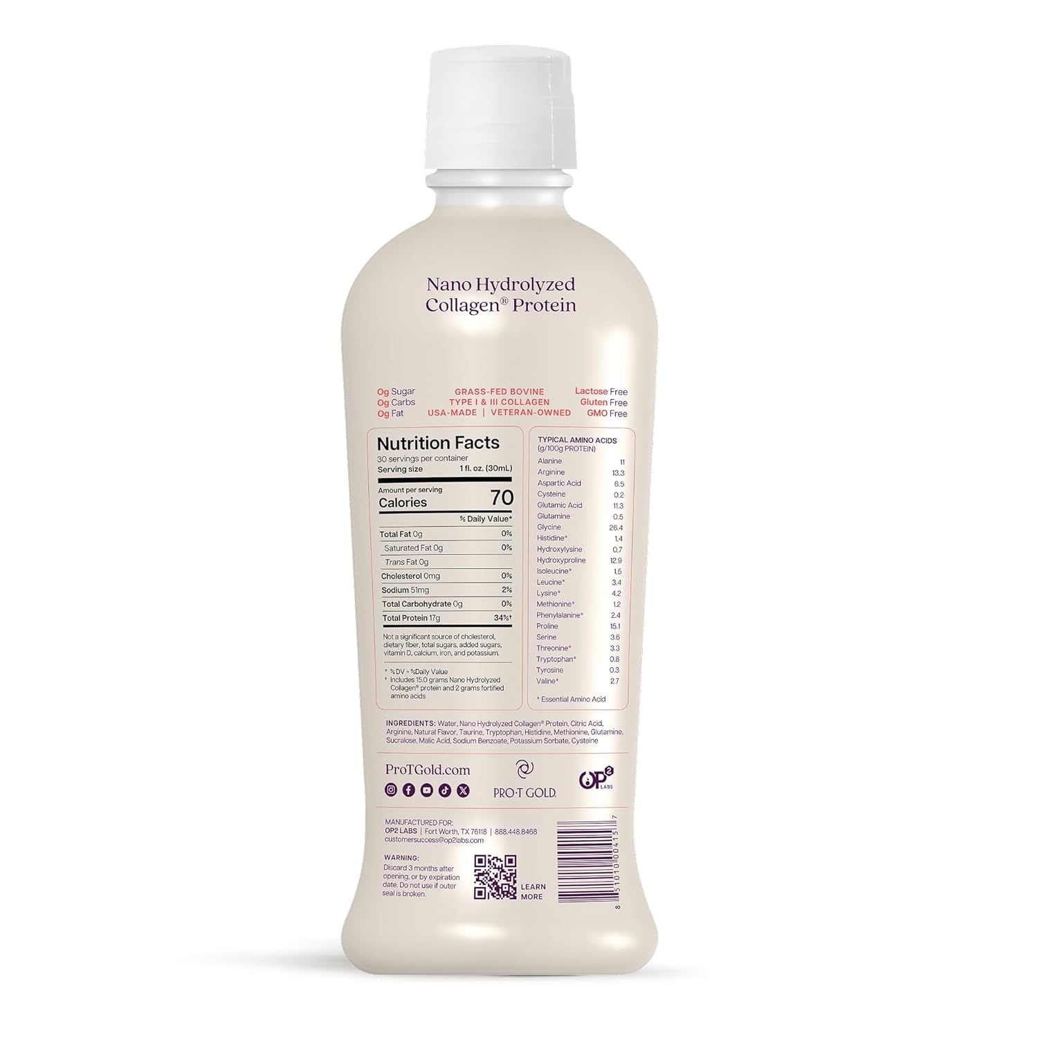 LIQUID COLLAGEN PROTEIN SHOT: ProT Gold is a COMPLETE Protein with 22 amino acids unlike other hydrolyzed collagen proteins. It is fortified with Arginine, Taurine, Tryptophan, Histidine, Methionine, Glutamine, and Cysteine. Each bottle has 30 servings and 17g of protein per each 1 fl oz serving.
