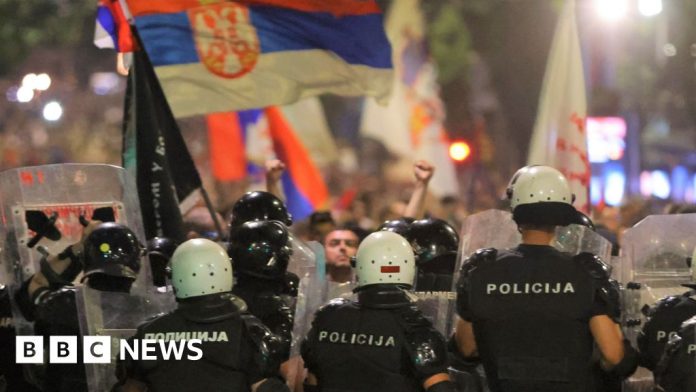 Serbian police have clashed with a huge crowd of anti-government protesters demanding an early election and end to President Aleksandar Vucic’s 12-year rule in the capital Belgrade.
