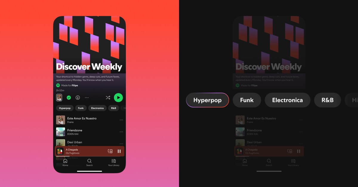 Spotify is adding new personalization features to Discover Weekly, the popular and influential playlist streamed by millions of users. The regularly updated playlist will now have buttons for genres like pop, R&B, and funk at the top, allowing users to tell Spotify what they want more of.