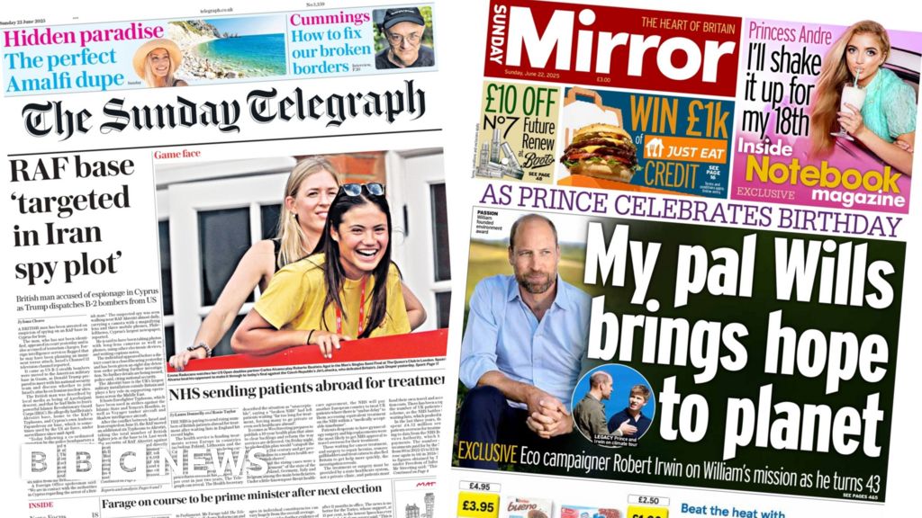 A wide range of stories feature on Sunday’s front pages. The Sunday Telegraph leads on the arrest of a British man on suspicion of spying and terror-related offences in Cyprus. He is thought to have carried out surveillance for Iran on an RAF base. The paper points out that this comes as the conflict in Iran continues. Separately, it reports that the NHS is sending “rising numbers” of patients abroad for treatment. The health secretary tells the paper this is “unacceptable” and that the government is working to “turn the NHS around”.