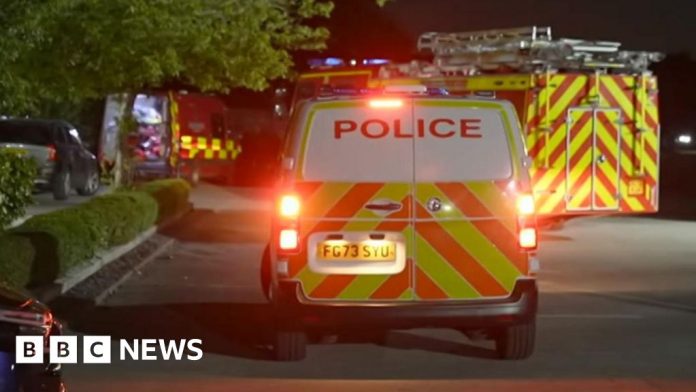 BBC The rear of a police van in a car park with yellow and orange chevrons on the back and its lights flashing with a fire engine behind itBBC