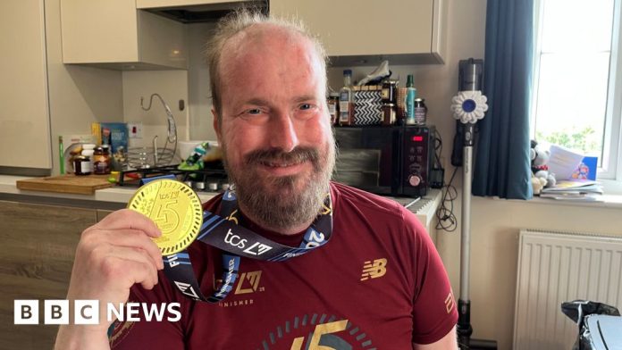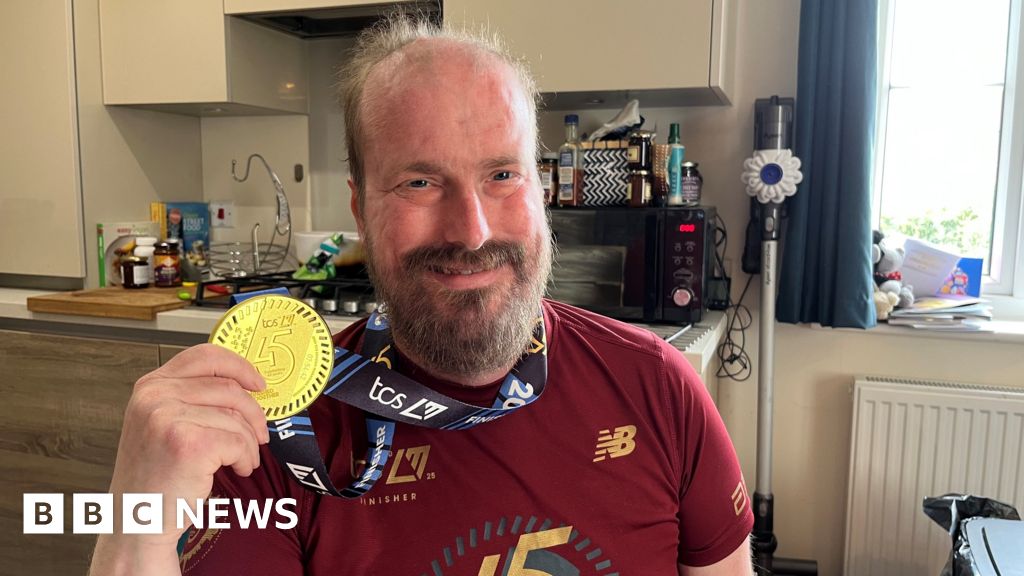 BBC Nathaniel Dye, 39, smiles as he holds a marathon winner's medal around his neck sitting at the kitchen table in his flatBBC