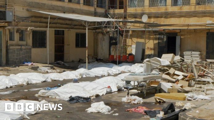BBC / Jon Donnison White plastic sheets cover bodies in the carpark of a hospital in Suweida. There is debris of chairs and hospital beds scattered across the ground tooBBC / Jon Donnison