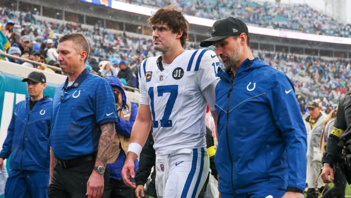 Daniel Jones exits the Colts’ Week 14 game vs. the Jaguars with an Achilles injury.
