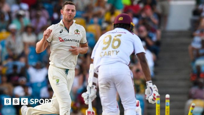 Hazlewood removed Jomel Warrican to finish with 5-43 before Nathan Lyon bagged two wickets in the final over of the day, after play had been extended by 30 minutes, to seal the win.
